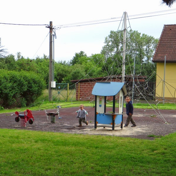 Tentokrát jsme výlet vyměnili za pochůzky po městě (aspoň s kafem, taky dobrý :)), ale odpoledne mě Mišák zase uhučel na výlet na kolech. Odmítala jsem jet už poněkolikátý stejný kolečko, tak jsem se rozhodla zaexperimentovat. Tentokrát jsme zamířili víc do města a zastavili se v Háječku (i já tam byla poprvý v životě :)) - park s rybníčkama (a kačenkama), další krásný hřiště navíc s venkovní posilovnou. Mimochodem, je samozřejmé, že právě ty posilovací stroje byly pro kluky tisíckrát přitažlivější než všechny prolejzačky dohromady. :) Vyblbli (jsme) se tam a jeli jsme dál, zase trochu oklikou. Začalo se podezřele mračit. Když jsme se napojovali na naši standardní cestu, tak už to vypadalo špatně - obloha černá, rozfoukalo se, byla to jen otázka času. A taky jo. Poslední tři kilometry už jsme jeli v dešti s usilovně šlapajícím, ale přesto ne dost rychle jedoucím Mišákem a brečícím Matesem. No, ten návrat jsme moc nevychytali, uznávám... Ale jinak to byl solidní desetikilometrový okruh, kdy jsem si Mišáka otestovala trochu i po městě a musím uznat, že už jezdí jedna radost. Přes prázdniny určitě někdy zkusíme pořádný cyklovýlet. :)