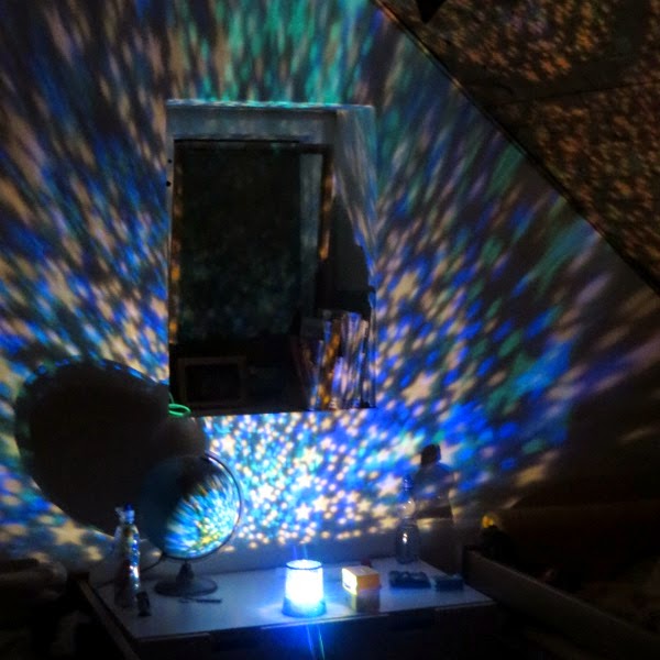 Závěrečné "hvězdičky", které si Mišák v solné jeskyni vyprosil (malá světýlka v jinak tmavém prostoru), mi připomněly jedno překvapení, co jsem pro kluky měla v záloze. Z netu jsem objednala "star-mastra" - projektor barevných hvězdiček na stěnu. Původně míněno spíš pro Mišáka, ale naprosto jsem nadchla Matese. Fascinovaly ho. Akorát s tím - pochopitelně - chtěl furt blikat, no... Tak uvidíme, jak dlouho ta věc za dvě stovky vydrží... :)